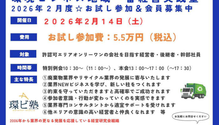 廃棄物業やリサイクル業の経営者・後継者・幹部社員向けの単なる一方的なセミナーではなく、環境ビジネス業界、とくに廃棄物・リサイクル業界の経営者や経営幹部、また、業界の更なる地位向上や業績アップ、課題解決などに役立つビジネスソリューションを持つ会社様などをゲスト講師にお招きし、業界の最新情報や参加企業様が、今まさに知りたい・解決したいテーマなどをディスカッション(発表&質疑応答)し、会員企業様の成功・失敗体験を共有し、お互いがさらにより良い会社づくりのため切磋琢磨するプラットフォームが環境ビジネス地域一番経営実践塾になります。